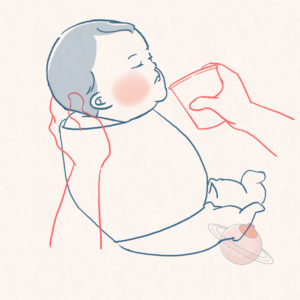 乳汁が赤ちゃんの唇に届くように、カップを傾けます。